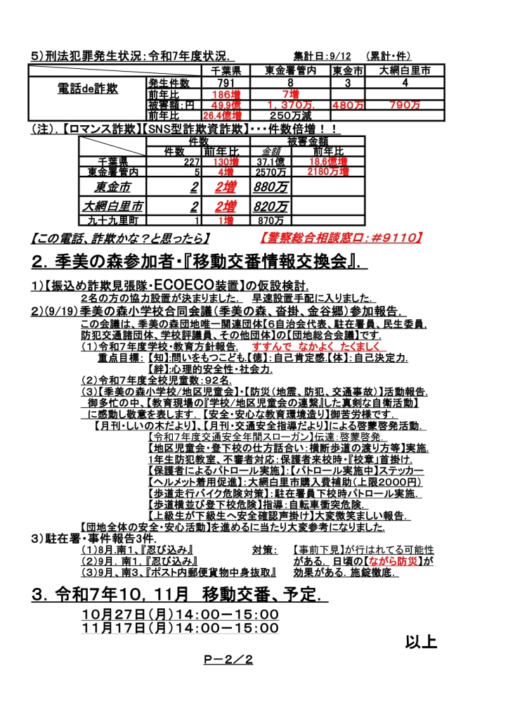 (9/22)東金警察署移動交番(季美の森)・参加報告を住民の皆様へ欄にアップいたしました。 は