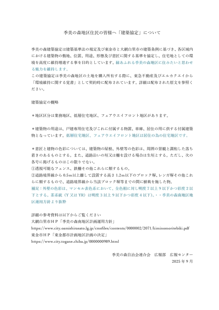 「季美の森地区の建築協定について」再確認しましょう! を「住民の皆様へ欄」にアップいたしました。