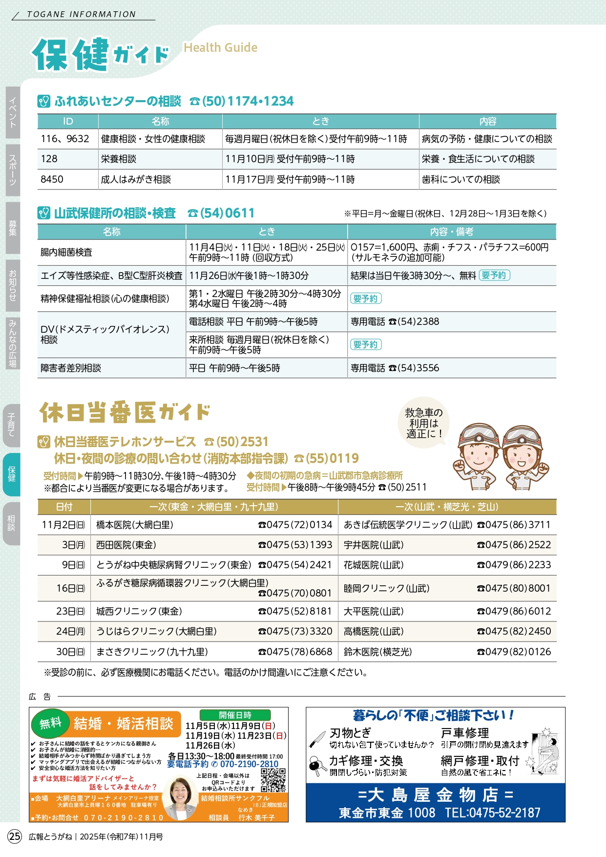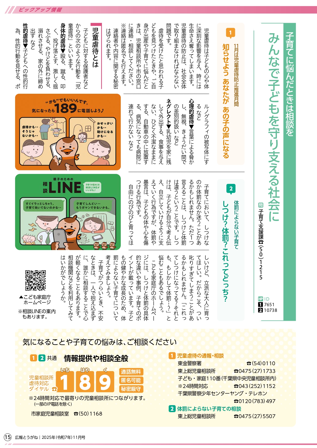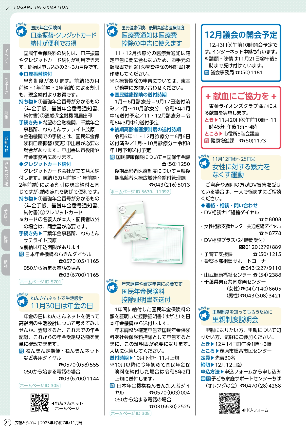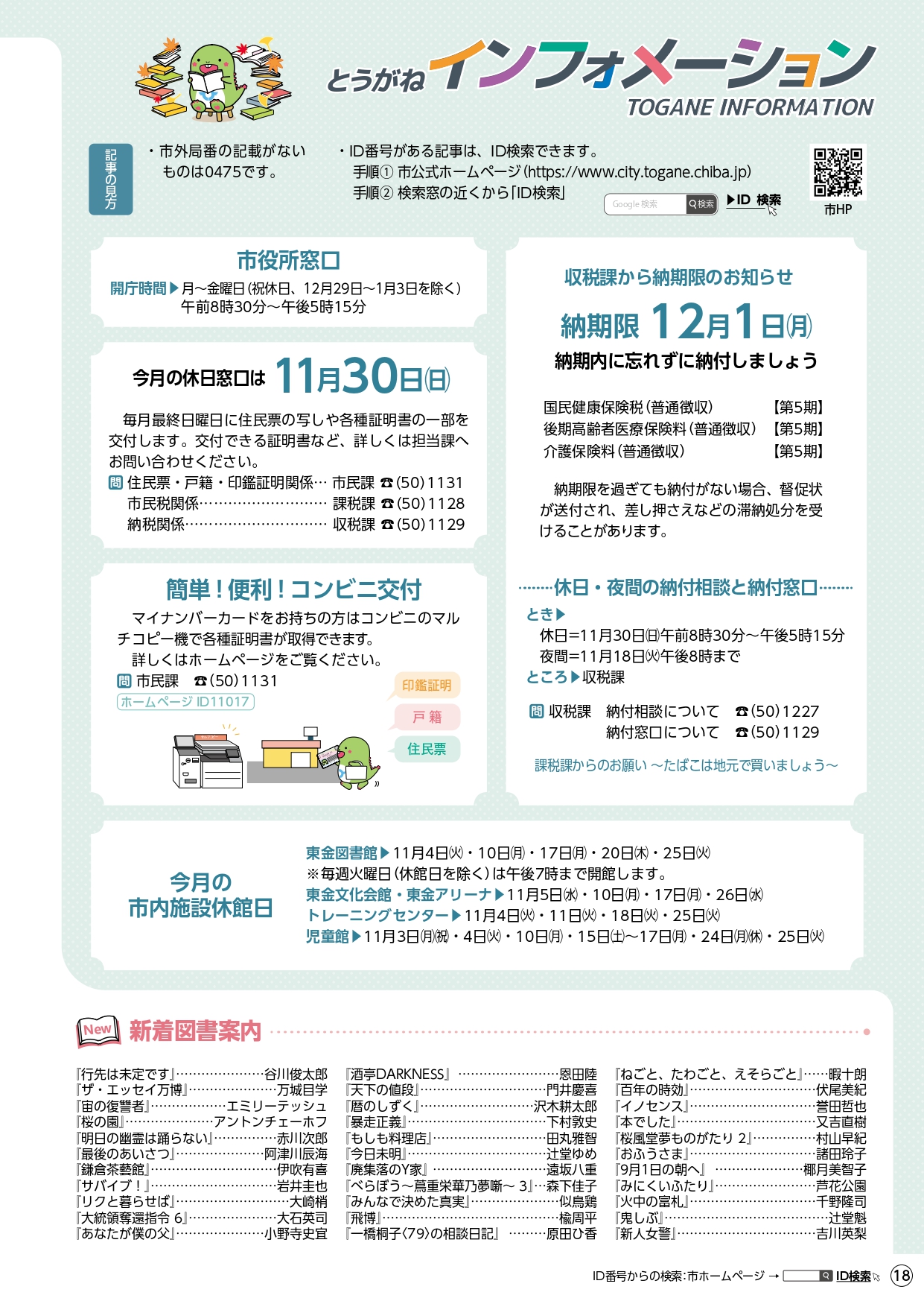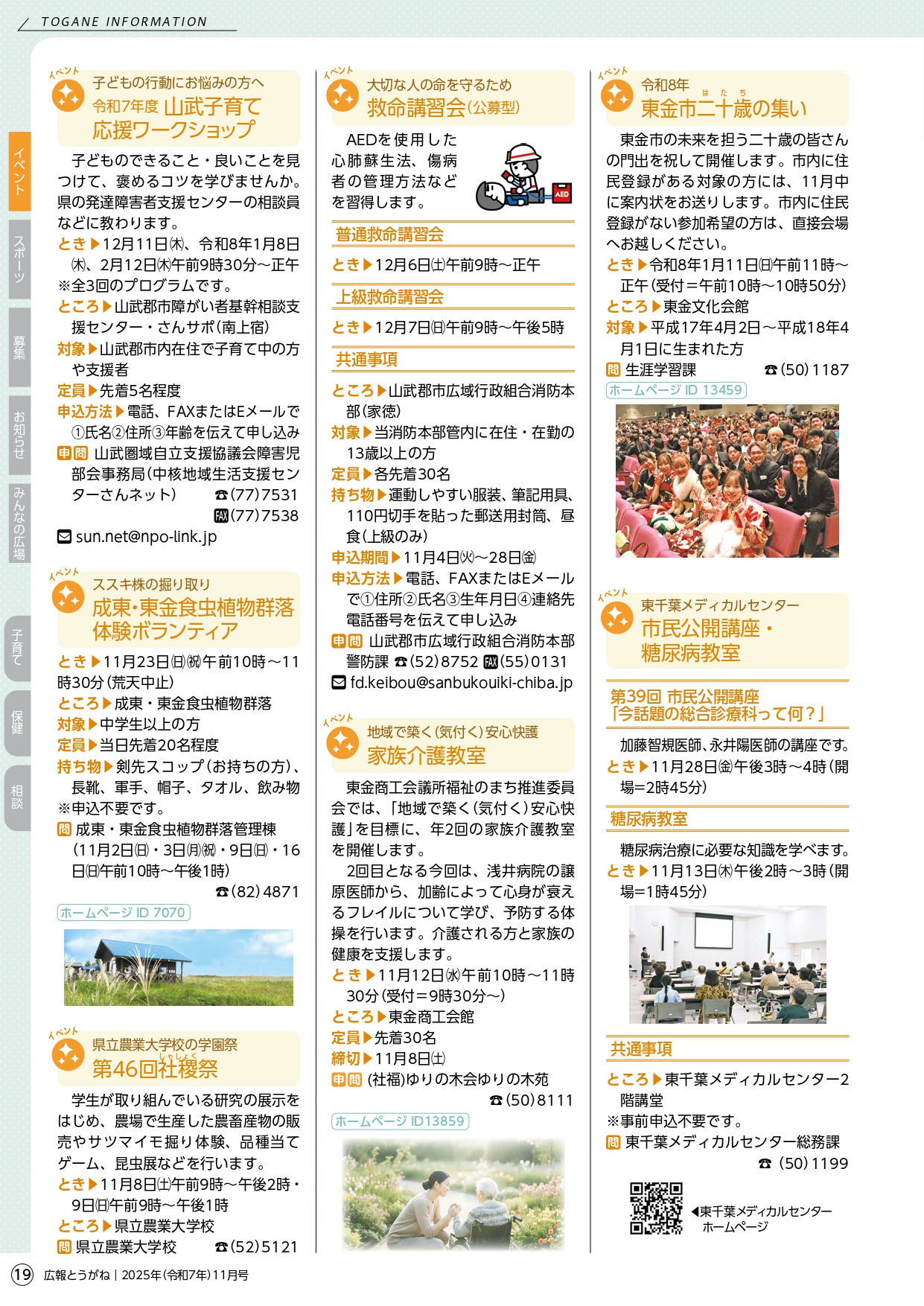 広報 「とうがね」11月号 発行元 東金市企画政策部秘書広報課広報広聴係 は